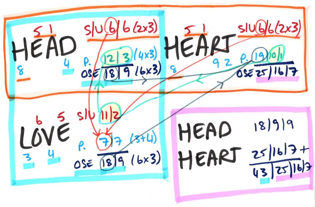 We can see from the above diagram how the words ‘Head’, ‘Heart’ and ‘Love’ are connected in terms of Numerology. We perhaps know from personal experience that when love is involved with whatever we are doing, it will work.