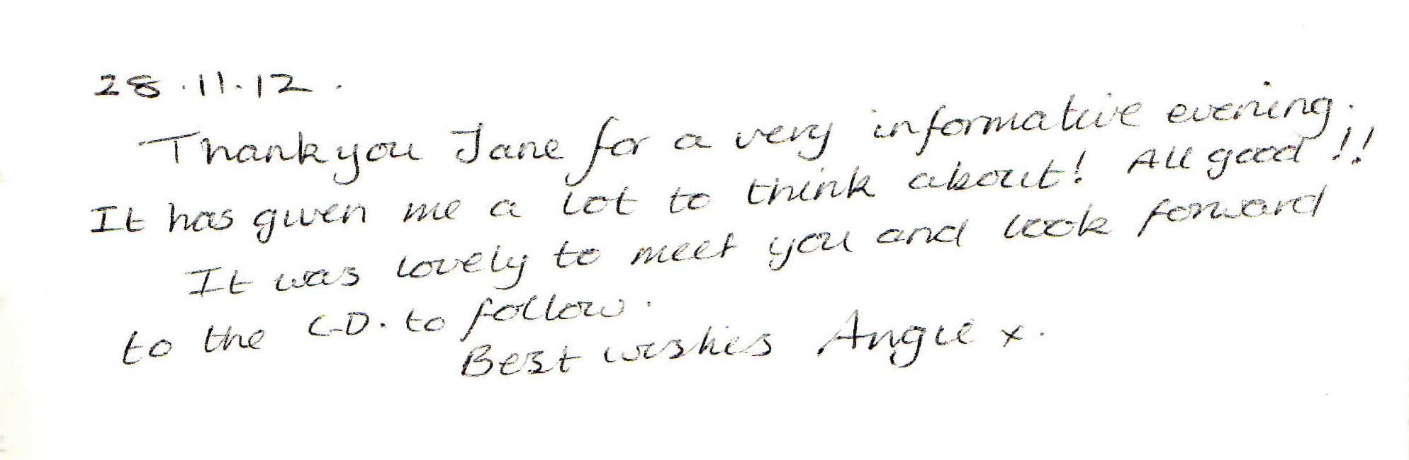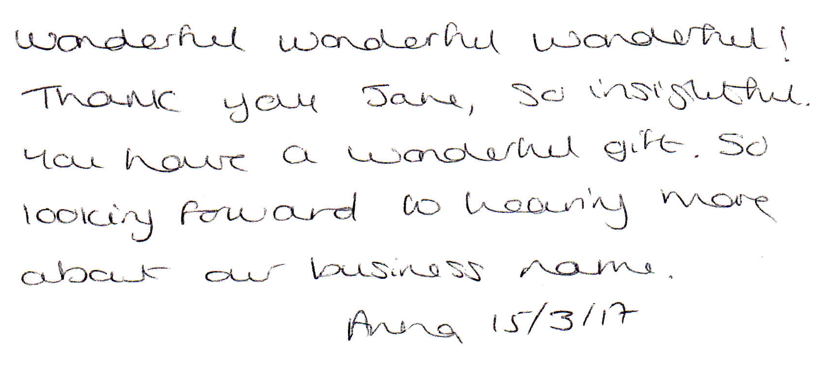 “Wonderful wonderful wonderful ! Thank you Jane, so insightful. You have a wonderful gift. So looking forward to hearing more about our business name”  Anna Pearce founder of Forest Row Spiritual Community Meet-Up Group
