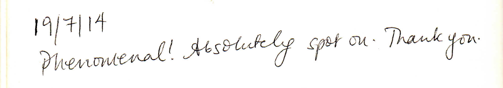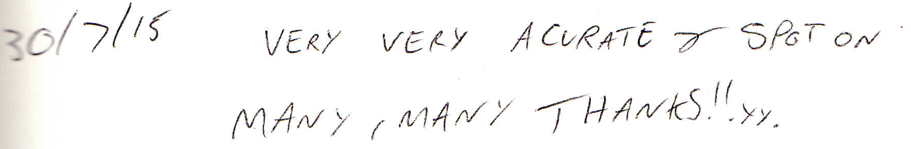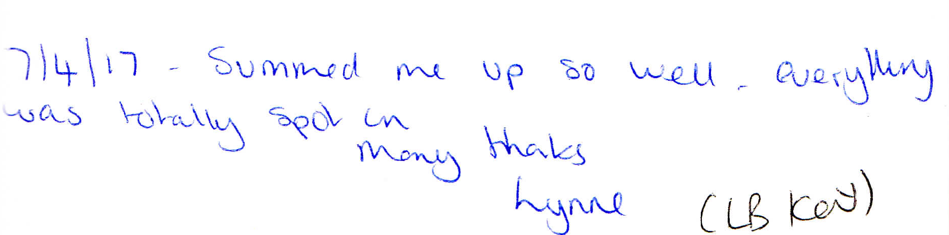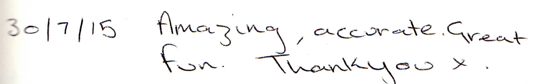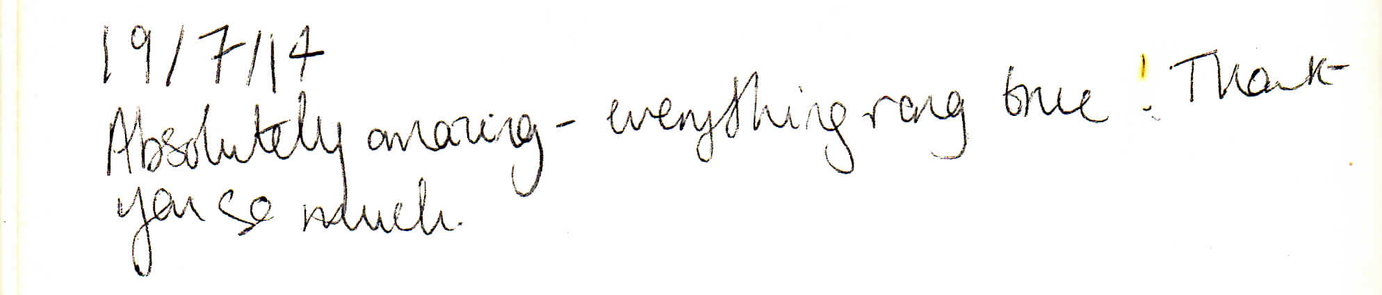 “Wow such accurate readings for us all at ‘The Centre’ You have great knowledge and inner wisdom and your sensitivity shines through. You have enforced our belief in the work that we do in ‘The Centre’.