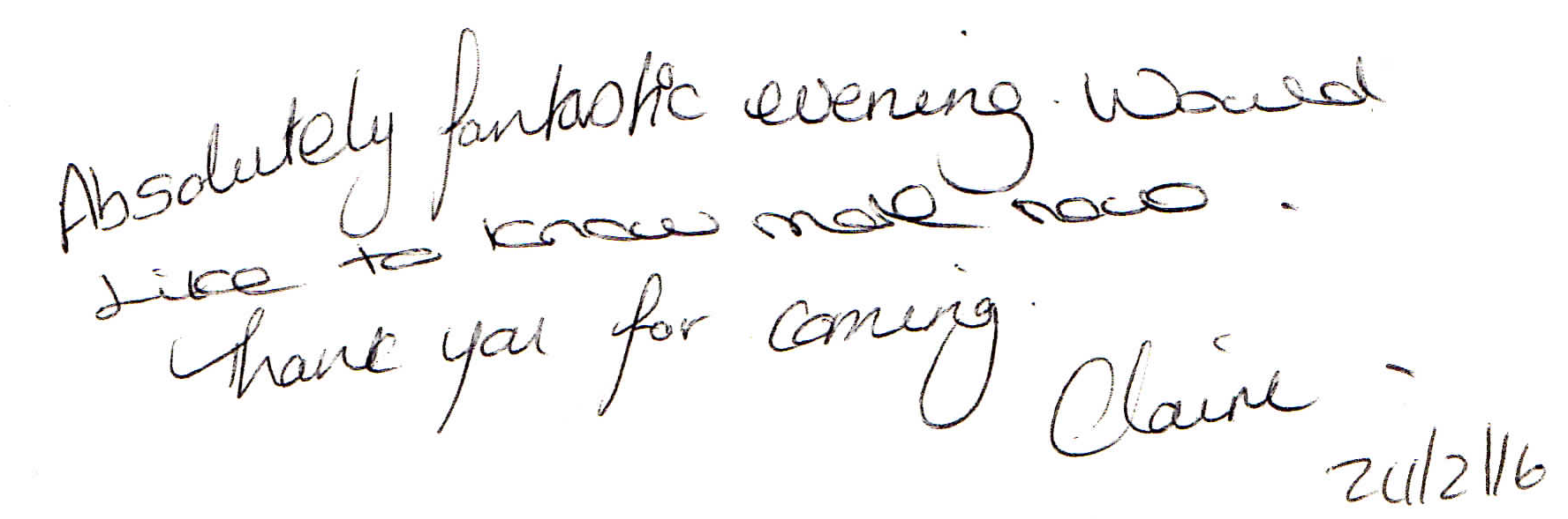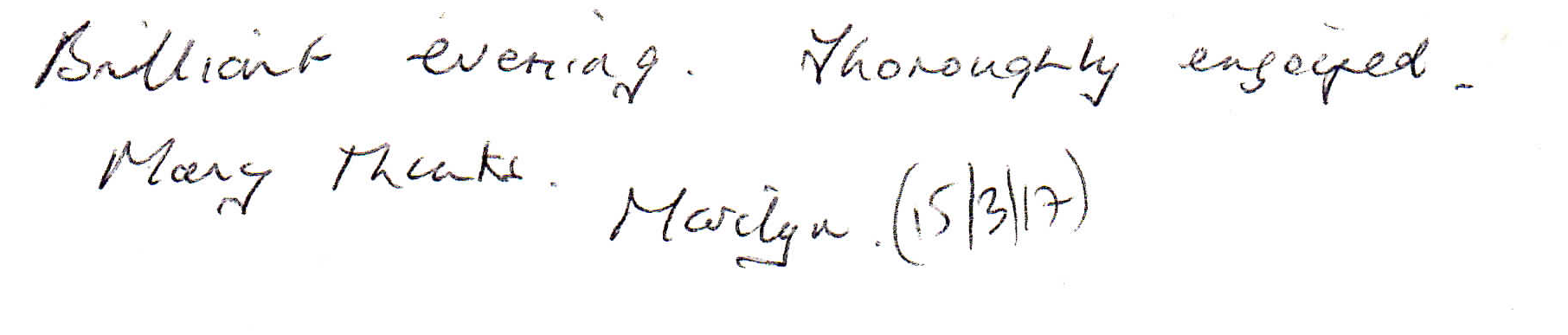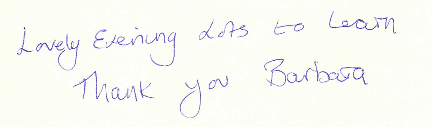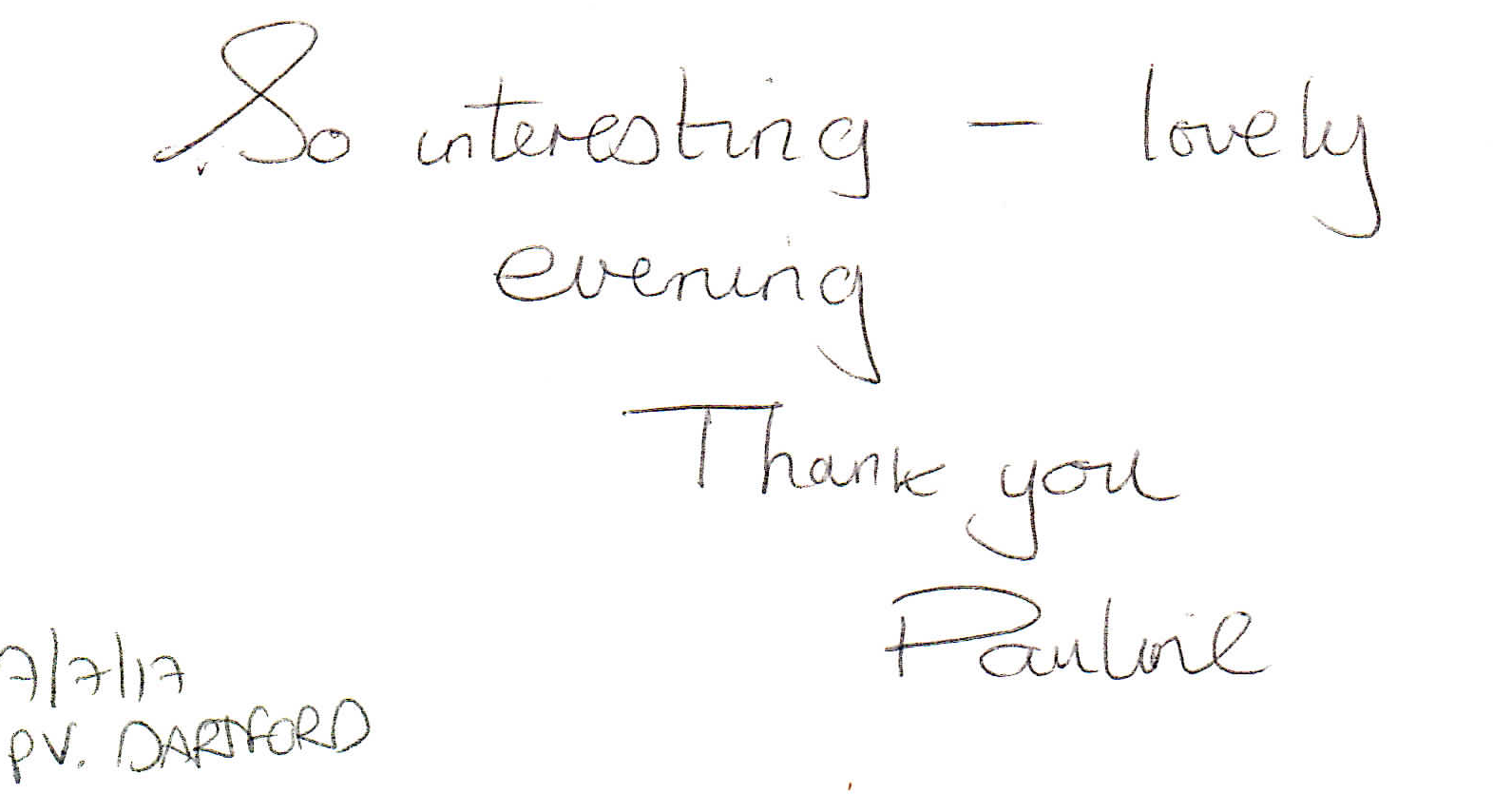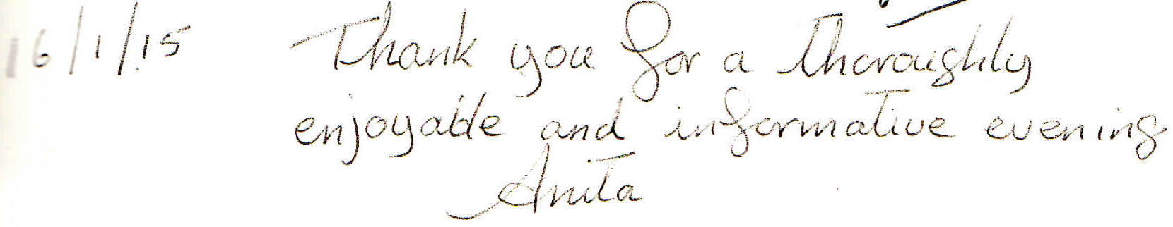 “Thanks you for a thoroughly enjoyable and informative evening”. AG, Kent