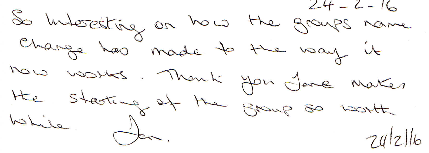 “So interesting how the groups name change has made to the way it now works. Thank you Jane makes the starting of the group so worthwhile”   JT from Maidstone of Dowding Development Group