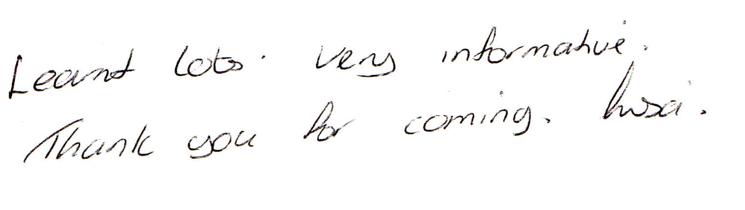 “I have been meaning to write to you sooner! Wanted to tell you that I really enjoyed and was fascinated by your presentation at Hourne Farm! Was incredible! Will you be doing another talk?”