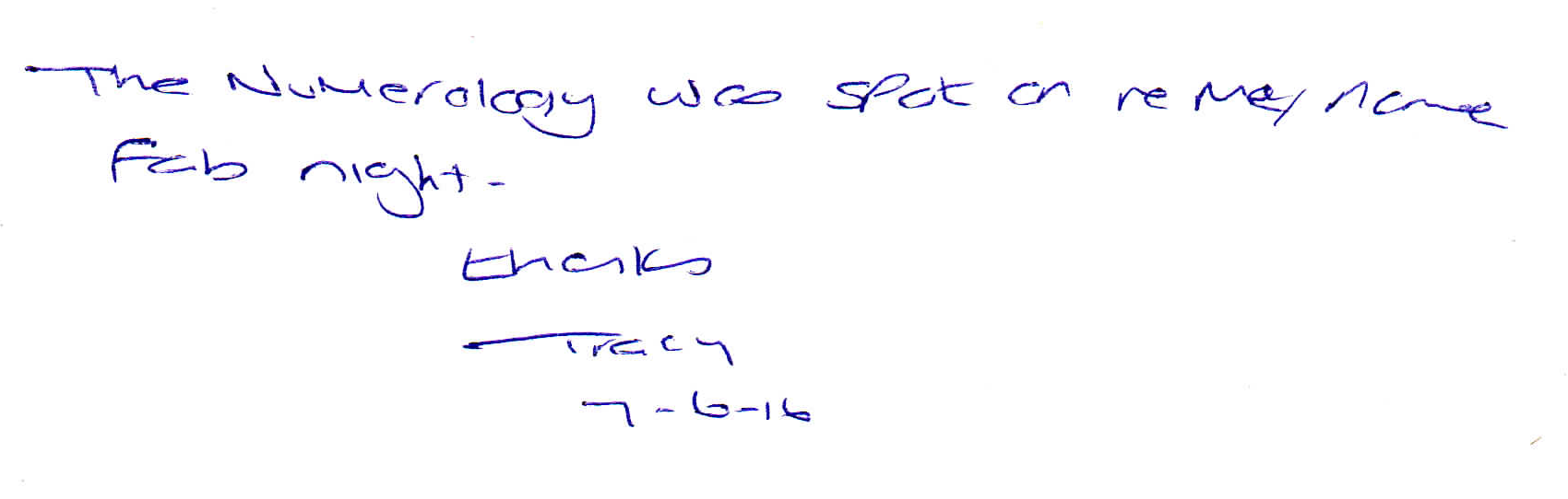 “A very belated BIG thank you for giving such a wonderful informative talk on Numerology on Wednesday evening. We were stunned by how accurate you were with all our personality traits. It is amazing. I found it fascinating how you explained the numbers going from 1 into the next number and so on, it makes so much sense!”