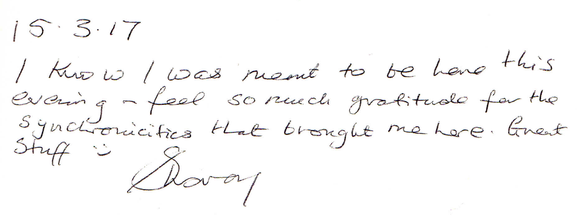 “I know I was meant to be here this evening – feel so much gratitude for the synchronicities that brought me here. Great stuff”  S. Forest Row Spiritual Community Meet-Up Group