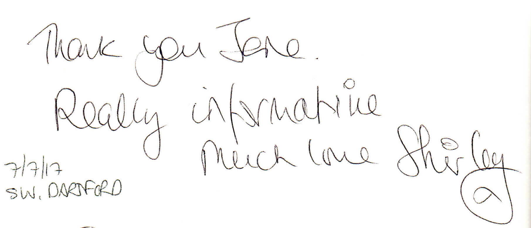 “It was so interesting and amazing how accurate the descriptions were. Thank you so much Liz for being such a good hostess. The hospitality was amazing and totally unexpected. Lovely to see everyone”. RS Canterbury & Thanet over 45s Group