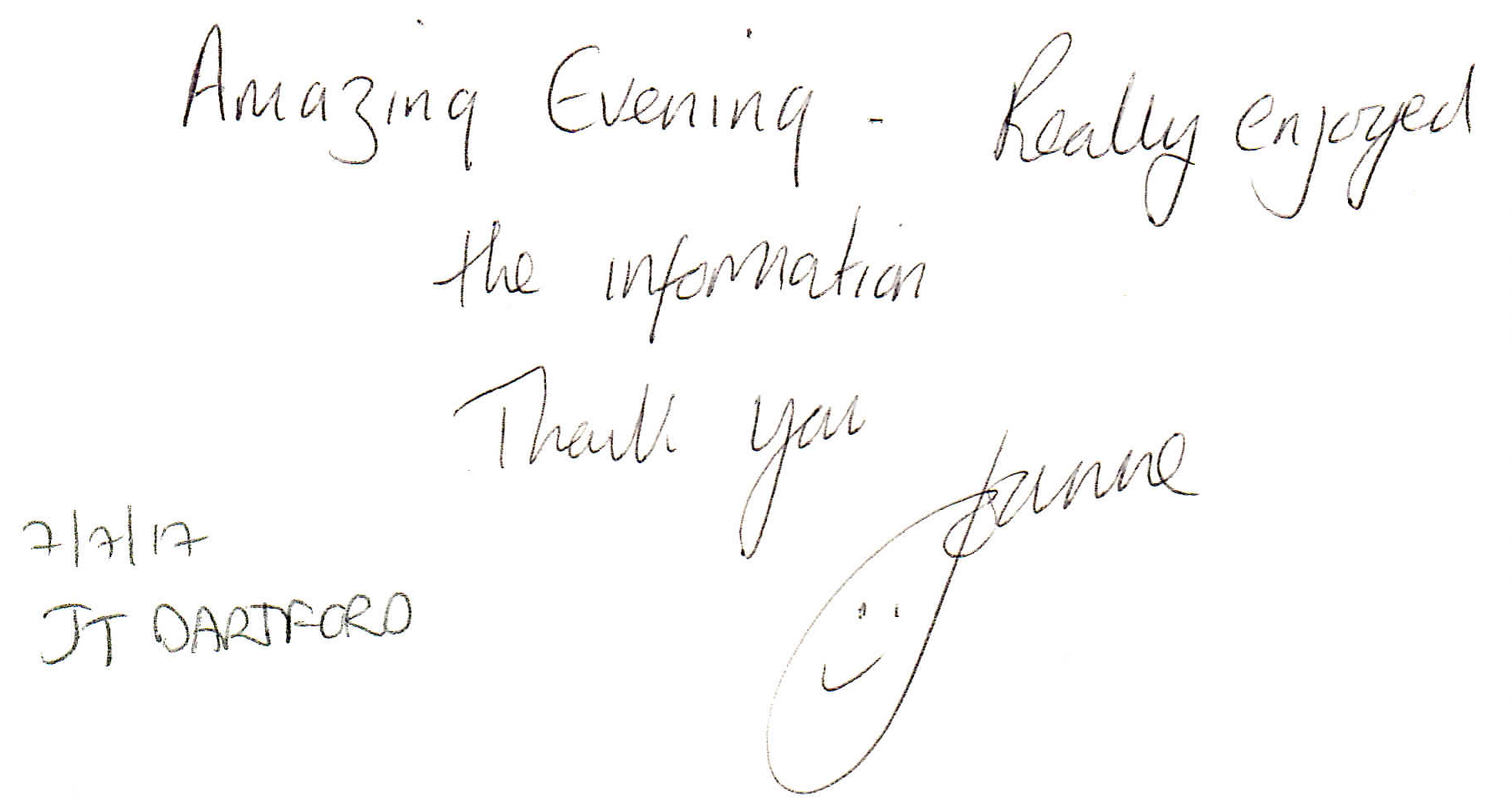 “Amazing evening – Really enjoyed the information. Thank you”  JT. Numerology Party, Dartford