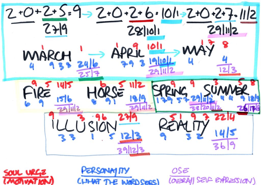 As illustrated above, the numbers generated from the words ‘March’, ‘April’, ‘May’, ‘Spring’ and ‘Summer’ compare strongly with the numbers generated from the years 2025, 2026 and 2027.
